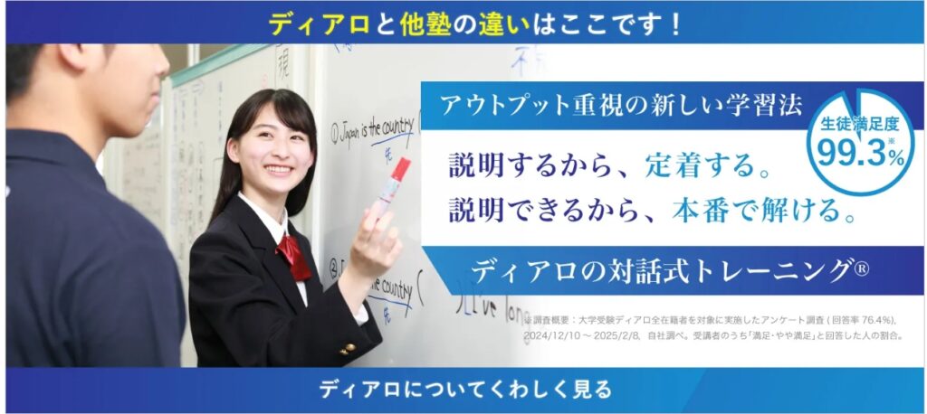 大学受験ディアロは、Z会グループの教材とノウハウを活用しながら、事前学習と対話型指導を組み合わせて理解を深めていく点が特徴です。あらかじめインプットした内容を自分の言葉で説明するトレーニングを通じて、知識の定着と論理的思考力を同時に高めることができます。講師は説明内容に対して質問を重ねることで理解の甘さを可視化し、曖昧な部分を徹底的に補強していくため、表面的な理解にとどまらず本質的な学力が身につきます。使用教材は難関大学レベルにも対応。