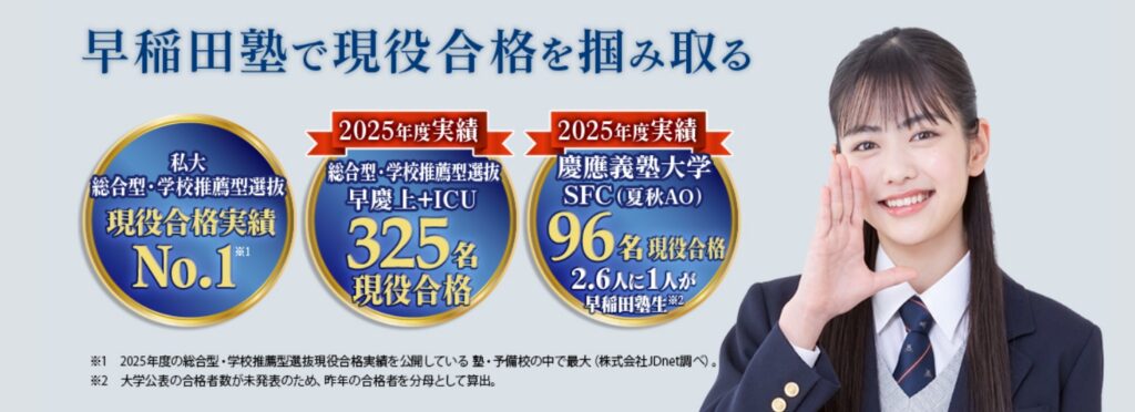 早稲田塾は、総合型選抜・学校推薦型選抜対策において高い実績を誇る大手塾です。最大の特徴は、「進路発見指導」を軸にした一貫した指導にあります。単なる受験対策にとどまらず、受講生が自分の将来像を明確にし、その実現に向けた進路を主体的に設計できるようサポートします。出願書類の対策も非常に特徴的です。志望理由書の添削だけでなく、進路発見指導と連動することで、「なぜこの大学・学部なのか」を深く掘り下げた説得力のある内容に仕上げていきます。このプロセスを通じて、受験対策と自己成長を同時に実現できる点が魅力です。また、全受講生が取り組む「論文系カリキュラム」により、文章力と論理的思考力を徹底的に鍛えます。小論文対策にとどまらず、あらゆる学習の基礎となる力を養成できるため、総合型選抜だけでなく一般選抜にも活きる力が身につきます。さらに、英語4技能試験対策や東進講座による一般入試対策など、多様な入試方式に対応している点も強みです。総合型選抜と一般選抜を両立したい受験生にとって、非常に安心できる環境といえるでしょう。加えて、大学教授や専門家と連携したフィールドワークや探究活動を通じて、実績作りや思考力の深化を図るプログラムも充実しています。こうした経験は、出願書類や面接において大きなアピールポイントとなります。